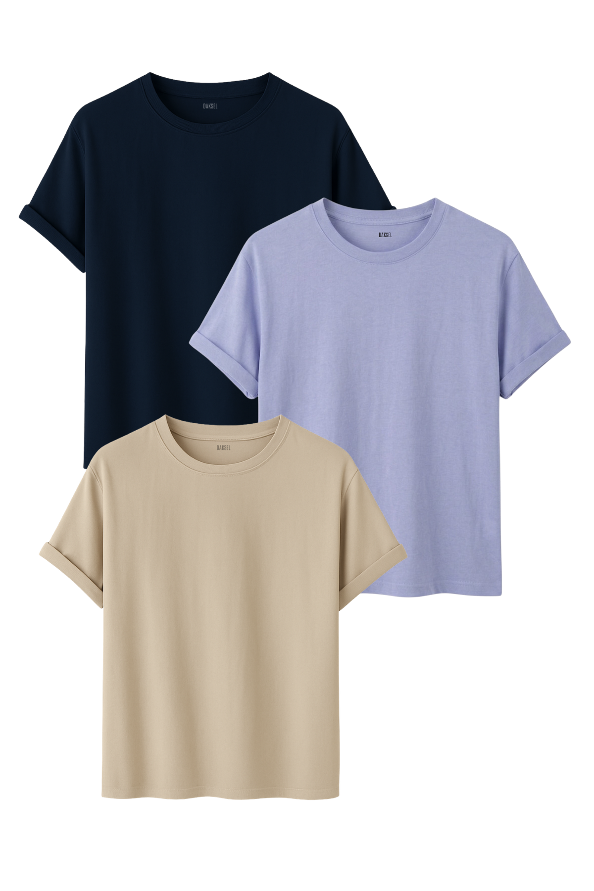 Lacivert, Mavi ve Taş renklerinden oluşan bu özel set, %100 pamuklu nefes alan dokusu ve Standart Kalıp yapısıyla gün boyu serinlik ve konfor sunar.