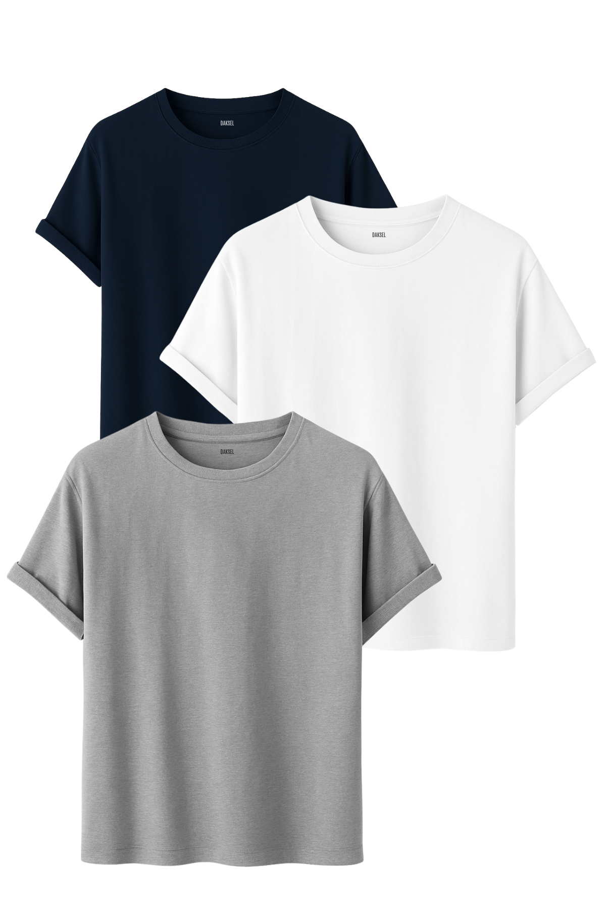 Lacivert, Beyaz ve Gri renklerinden oluşan bu joker set, %100 pamuklu nefes alan dokusu ve Standart Fit formuyla stilinize zahmetsiz bir zerafet ve gün boyu ferahlık katar.