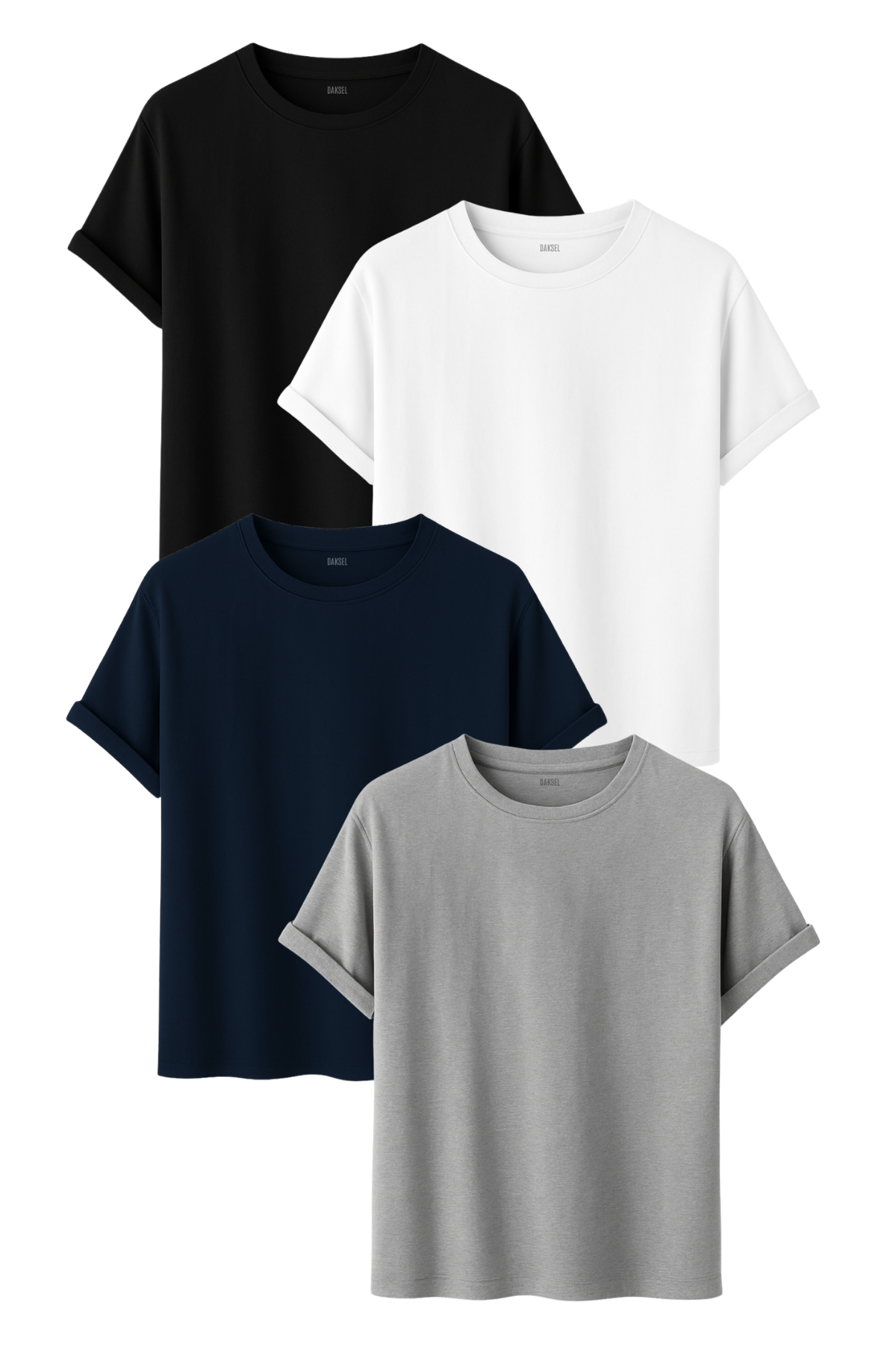 Siyah, Beyaz, Lacivert ve Gri renklerinden oluşan bu 4'lü set, %100 pamuklu nefes alan dokusu ve ideal Standart Fit (Regular Fit) kalıbıyla günlük şıklığınızın garantisidir.